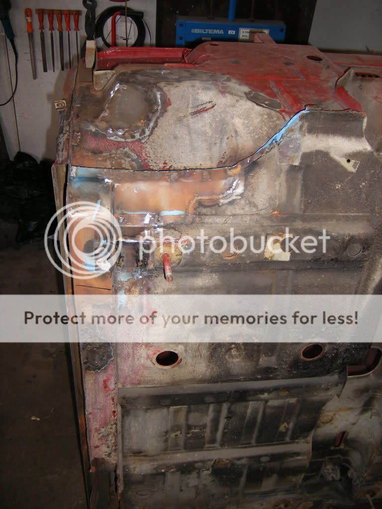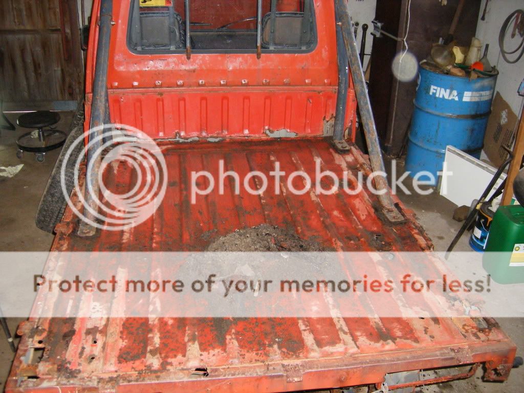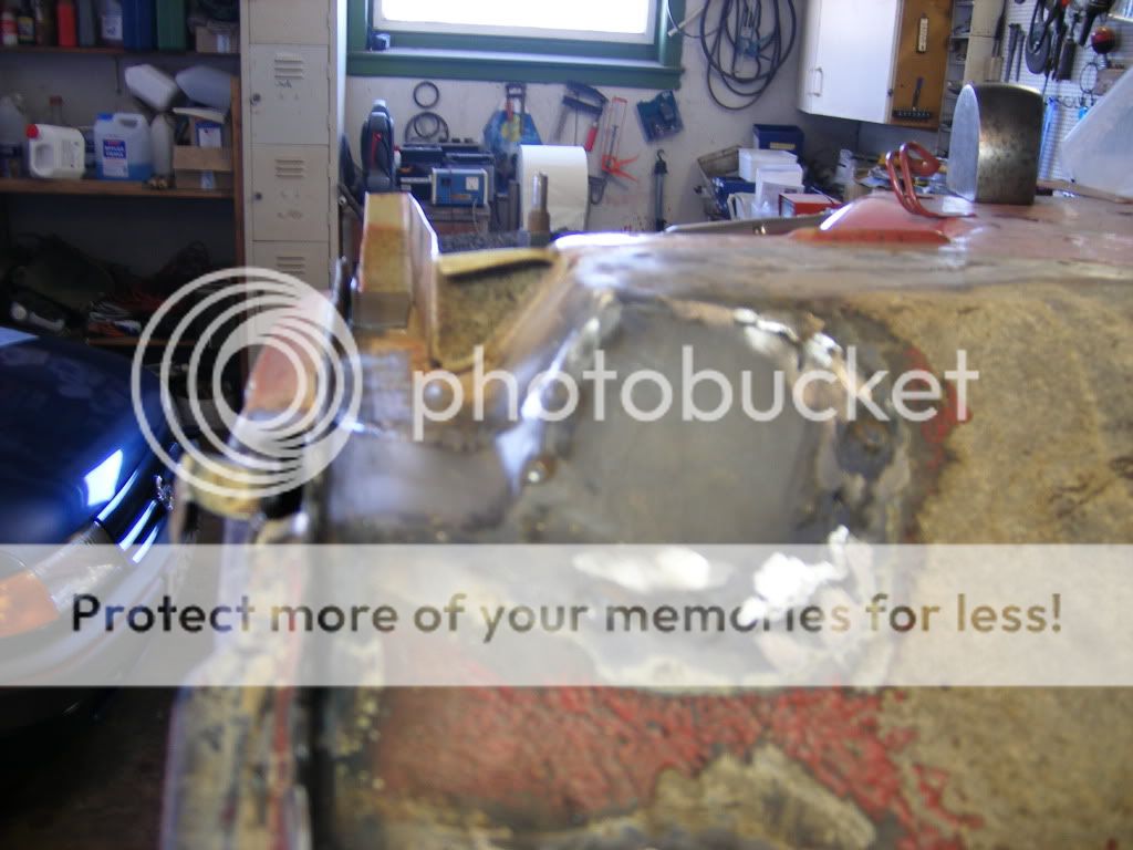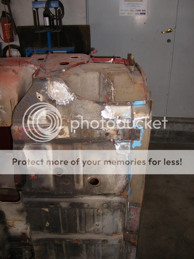 er så usikker på hva jeg skal gjøre her. på bildene så ser man en brun stripe langs hele kanten av veggen, og der er det rust. det ligger sand/rust/sikaflex mellom de to platene som overlapper hverandre. og så er spørsmålet, skal jeg kappe av hele den nedre delen av bakveggen, og lage ny? skal jeg borre opp punktene i bunnen av veggen der og få reingjort mellom platene og så satse på at jeg får sveisa det på plass igjen? eller skal jeg gi blanke F i det?
