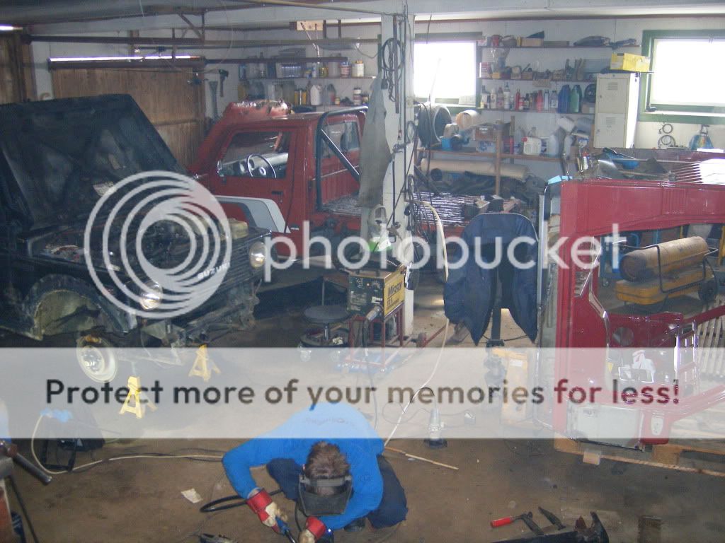 bror holder på å sveise fester på framfanger på hans 413 som står der. den ene PU'n står oxo i garasjen, samt karosseriet til den jeg holder på med. og samuraien står på utsiden av garasjeporten