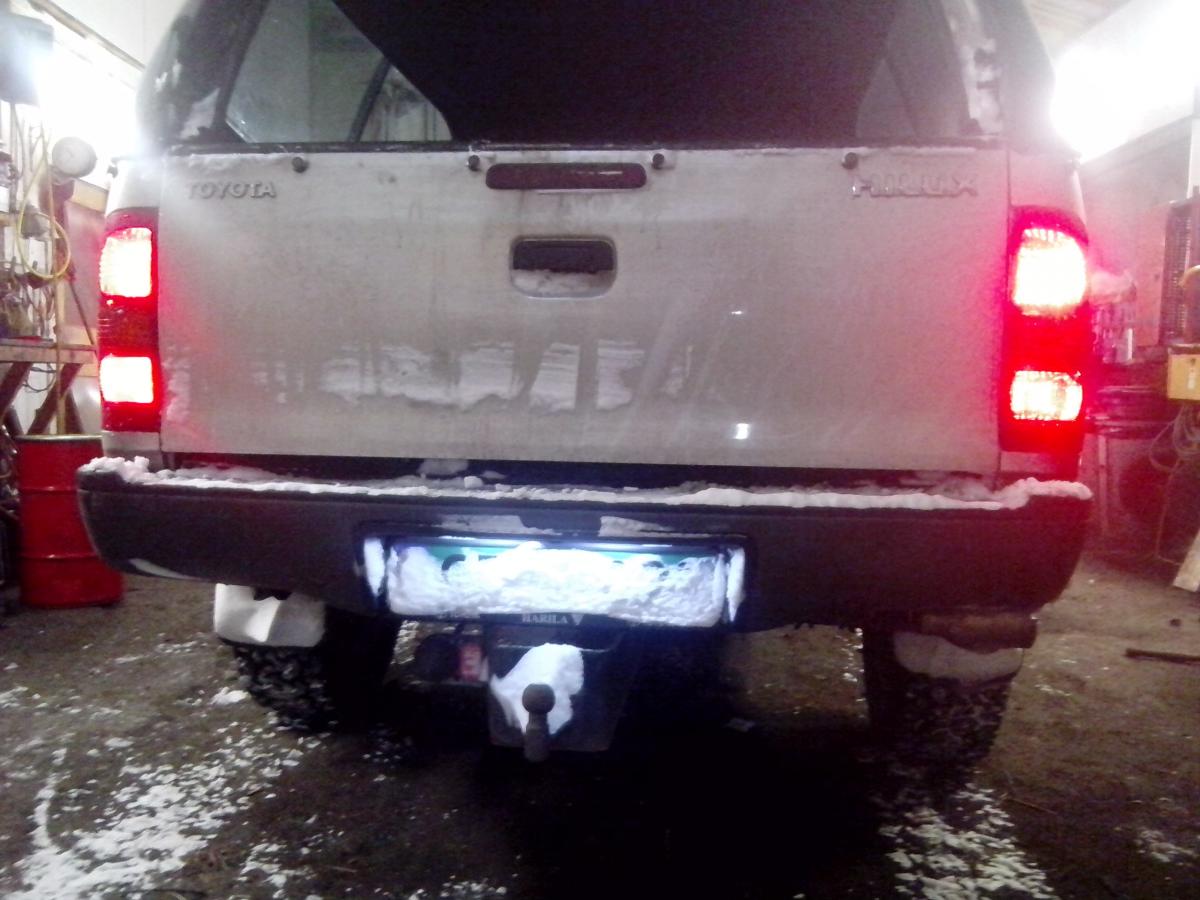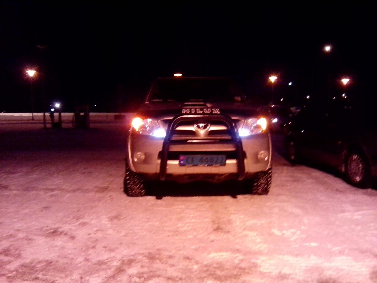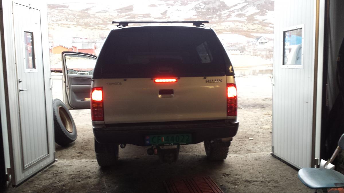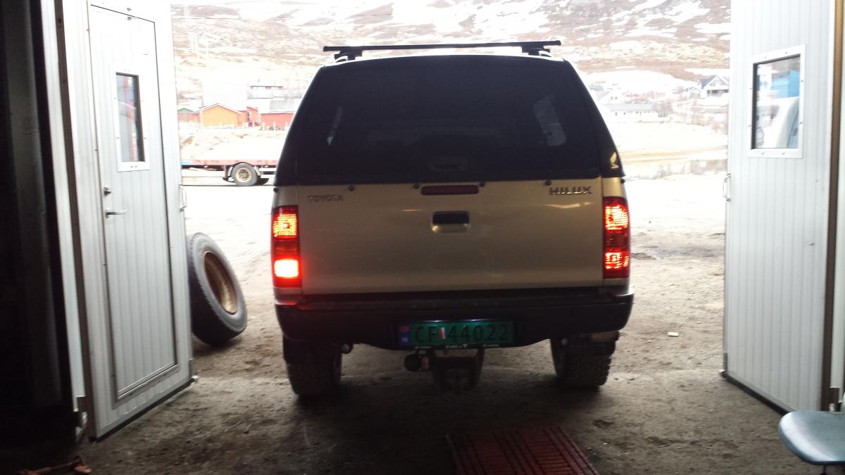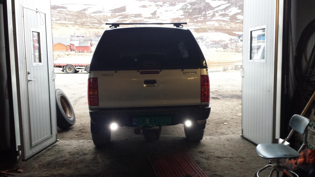 og bestille LED arbeidslys for og felle inn i støtfanger så æ må vente til dæ kommer eller montere ett midlertidig vanlig arbeidslys som ryggelys.