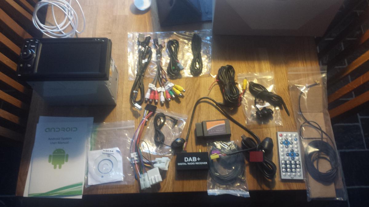 Og no det siste innkjøpet e ny spiller med ALT. 2 DIN Android spiller med navigasjon, DAB+, kamera forover, ryggekamera, OBD2, Handsfree, tilkobling til Iphone, USB, Bluetoth, WIFI masse rart. og en donge med kabla og kontakter. Det skal bli spennanes og se om man får plass til alt.