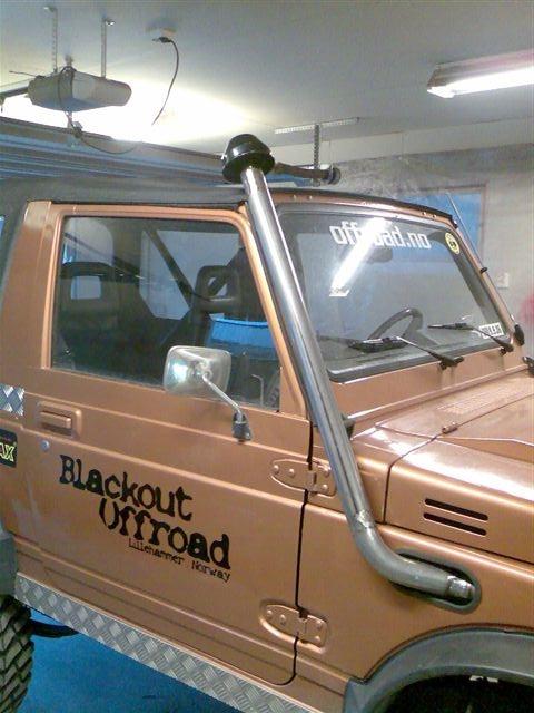 Snorkelen er sveisa av simons 2" eksosanlegg deler og luftinntak fra traktor. Bilen har 1" bodylift og 80mm Trailmaster hevesett.