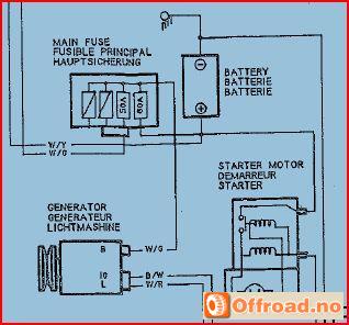 Du skal ha en ledning fra tenningen som skal slå inn startrelet på starteren. Det er den Sorte med hvit tracer på. Den går fra starteren og deler seg slik at en del går til air-condition-kontakten og en utløper går til relet (eller innslaget) på starteren. Så skal det være en grov ledning fra starteren til hovedsikringen som igjen er koblet til batteriets plusspol.. Så er det negativ pol i starteren i jordingen i monteringen den er koblet til batteriets negative pol eller på en grov ledning somkommer derfra.. Når du vrir nøkkelen så drar den inn innslaget og kobler på strøm slik at starteren drar rundt.