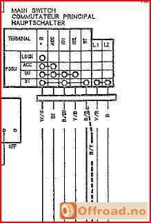 Den blå fra tenninga går ut til sikring og kommer ut som hvit med sort tracer og går videre til sigaretttenner, radio og klokke.