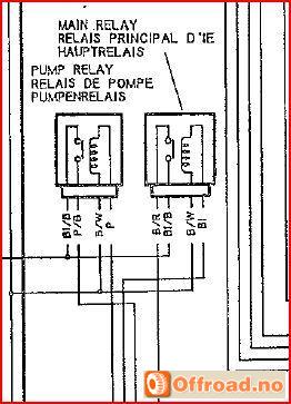 Den hvite med grønn tracer på tenninga går til sikringene og kommer ut som sort med rød tracer. Den går inn på hovedreleet (det er den tilkoblingen vi kalte A) og kommer ut derfra som blå med sort tracer (det er den vi kalte B ). Den går videre inn på bensinpumpereleet (på den vi kalte A der) og deler seg samtidig utover i det nye ledningsnettet.