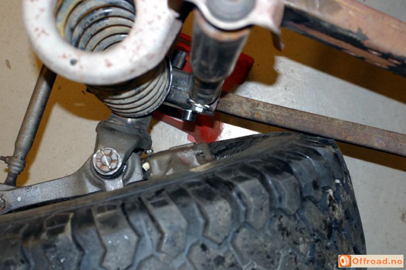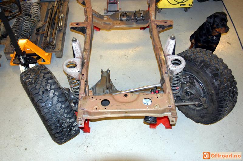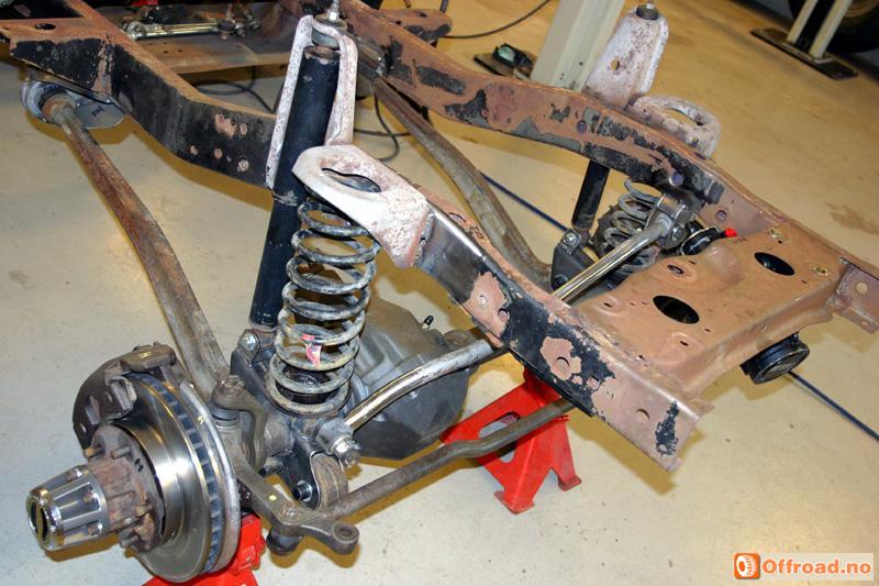 Når man skal ha Scoutakslinger må bladfjærene komme på utsida av ramma framme på grunn av at diffen kommer så langt til siden. Dette var mannen på BT ikke helt happy for, så han foreslo i steden at jeg bygde om til spiraler. Jeg hadde ikke drømt om å spørre engang, men ble i fyr og flamme når han foreslo det. Dermed diskuterte vi litt løsninger og ble enige om at et oppsett fra enten mercedes eller Toyota var kurant.
