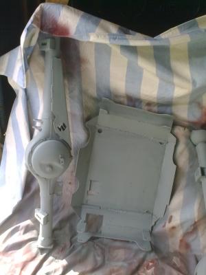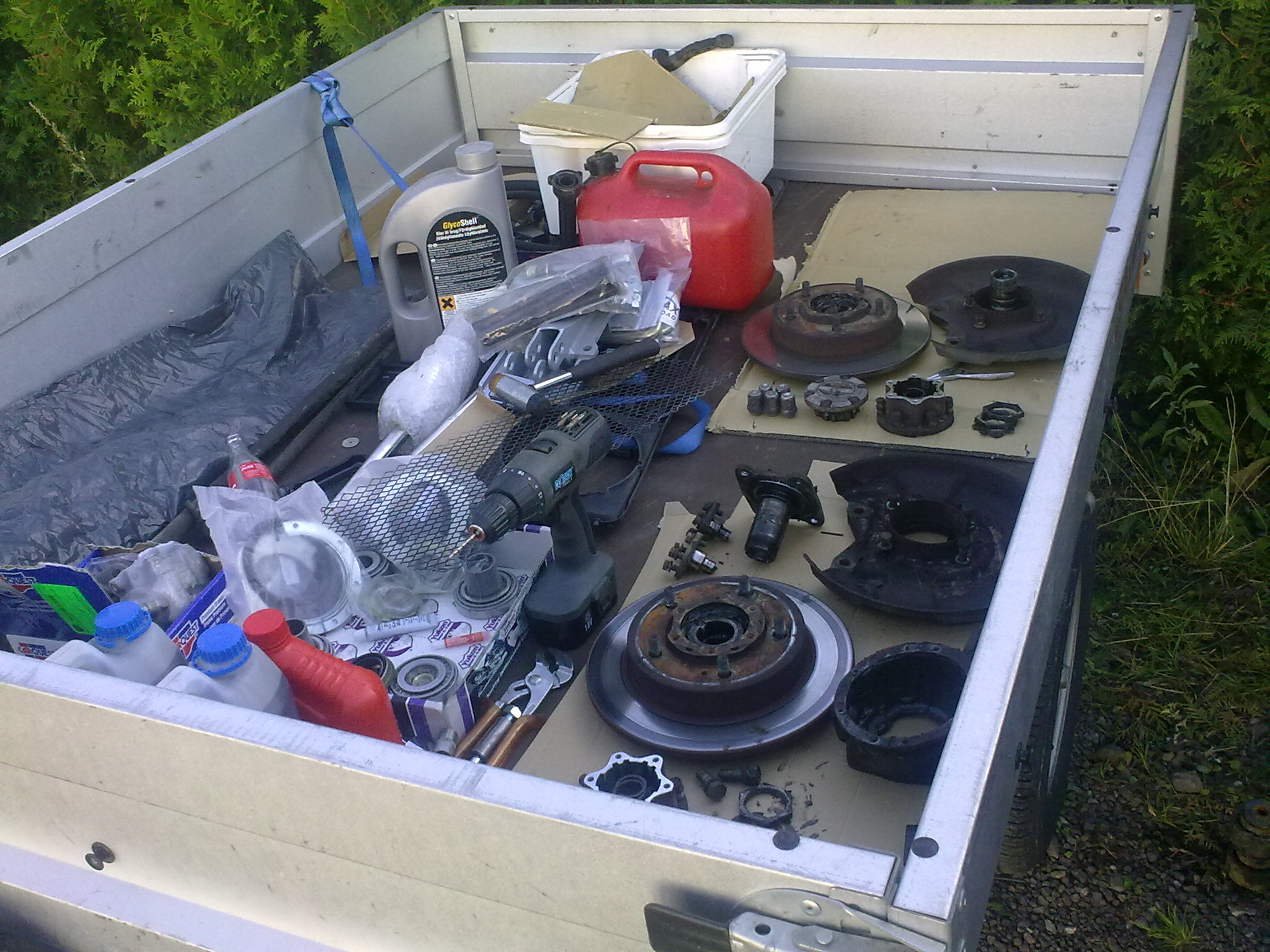 Siden jeg jobber ute så bruker jeg tilhengeren som lager og arbeidsbord slik at jeg får lagt opp delene skikkelig uten å rote vekk skruer og diverse smådeler.