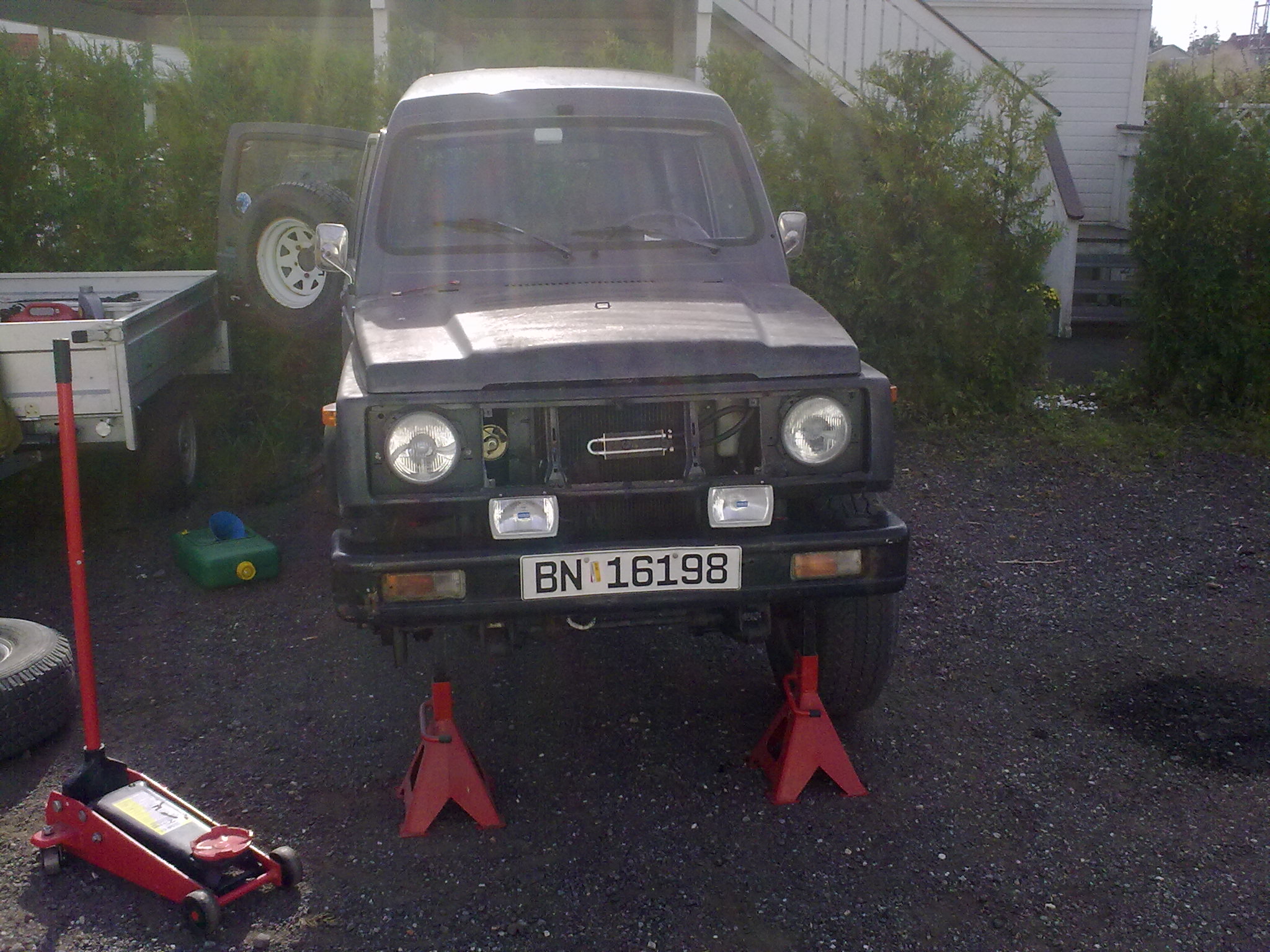 Satte bilen opp på to bukker og begynner foran, har en tendens til at jeg alltid ender opp med å skru utendørs. Garasjen er så full av all verdens bildeler atbilen får ikke plass.