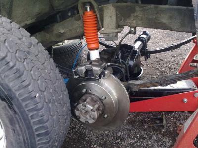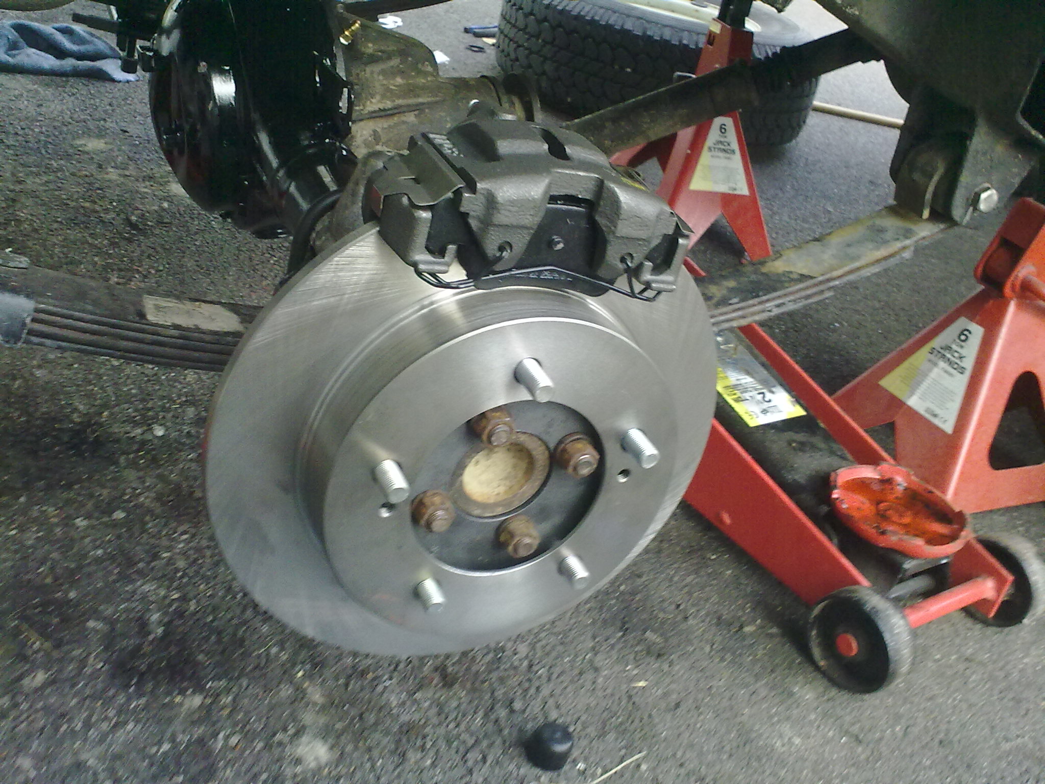 Tydelig god plass mellom bremseskive/caliper og bladfjærene. Det er god plass til dekk her siden dette oppsettet gir 40 mm mer klaring enn originalt.