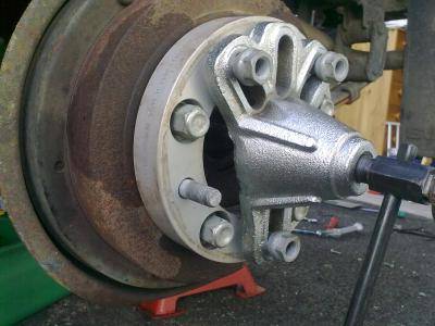 Siden det er både 5 hjulbolter og de fire senterboltene er det håpløst å få satt på noen vettug avdrager så jeg løste det med å skru på spacer på trommelen og så sette avdrageren på den. Fungerte godt, men på den ene trommelen var det så fastrustet at jeg måtte bruke en kraftarm for å klare å dra rundt.