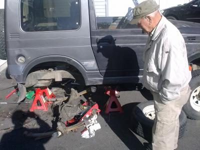 Fadern er alltid innom for å sjekke framgangen på jobbingen med bilen og har ofte noen tips for løsning. Her er bakakslingen løsnet. Boltene som holder fjærene satt så fast at det eneste fornuftige var å kappe dem med vinkelsliper. De tynne kappeskivene til Biltema som er beregnet på rustfritt er ypperlige. Jeg skulle sette inn nye bolter likevel. Bare husk å tømme akslingen for olje, ellers blir det er fryktelig søl når den bikkes ned litt skrått.