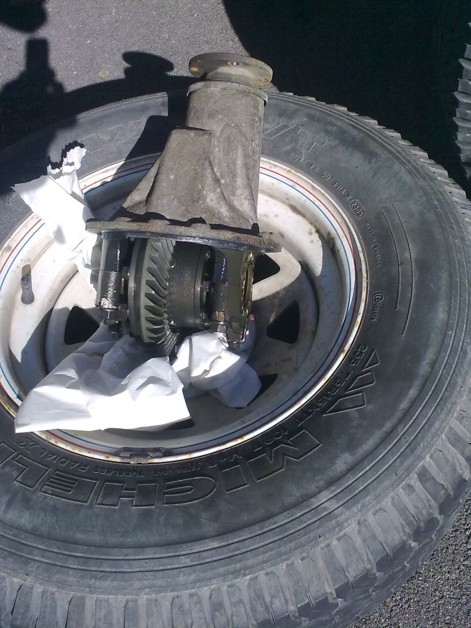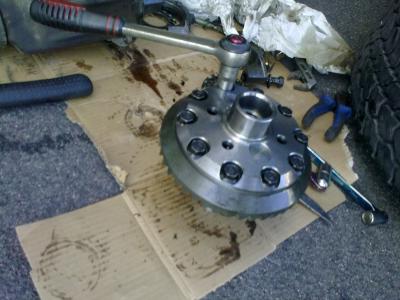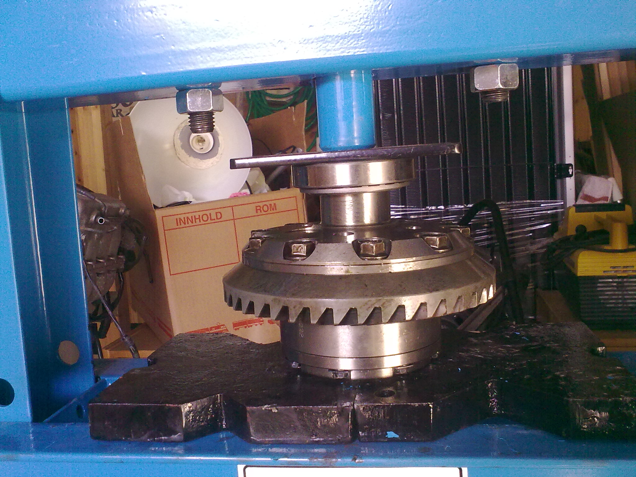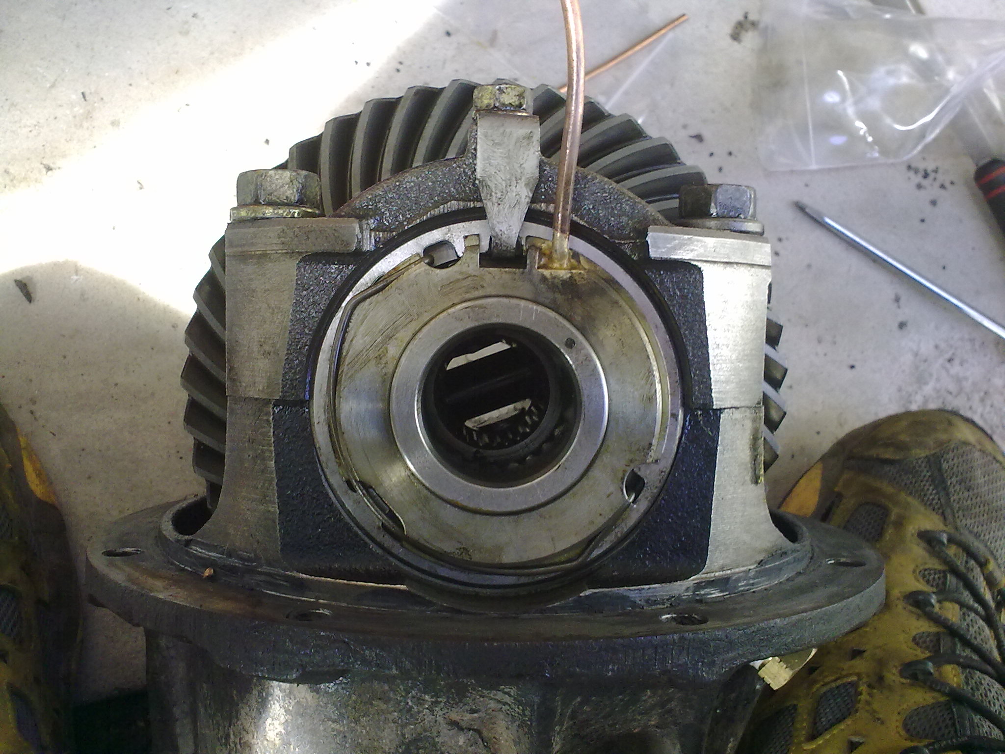 Her er diffklumpen løsnet fra akslingen og nå er neste steg å skru av selve diffen for å ta av kronhjulet.