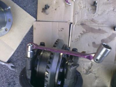 Først plukker en av de to låsebøylene som sitter på toppen av bøylene som holder lagerene på plass, deretter løsner jeg skruene som holder kronhjulet og så løsner jeg de fire skruene som holder hele diffen på plass.