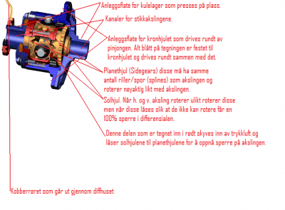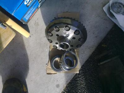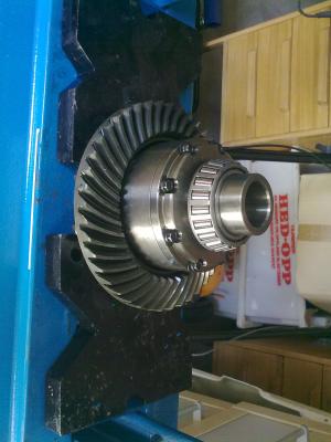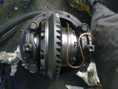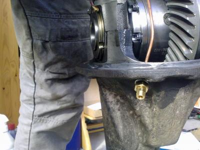 På den siden av ARB som kronhjulet sitter bruker du opp igjen alle delene mens på den andre siden med den lange stussen følger de med en ny strammeskrue/strammeskive. Har omtrent samme utvendige diameter som lageret har utvendig. Når du setter inn ARB i diffen igjen pass på at den ligger slik at kronhjulet griper godt inn i pinjongen. Og så må du være nøye med å sette ned strammehjulene i gjengene slik at de står rett. Skru dem inn til de tetter godt inntil ARB uten slark. Etterpå setter du på broene over gjengene.