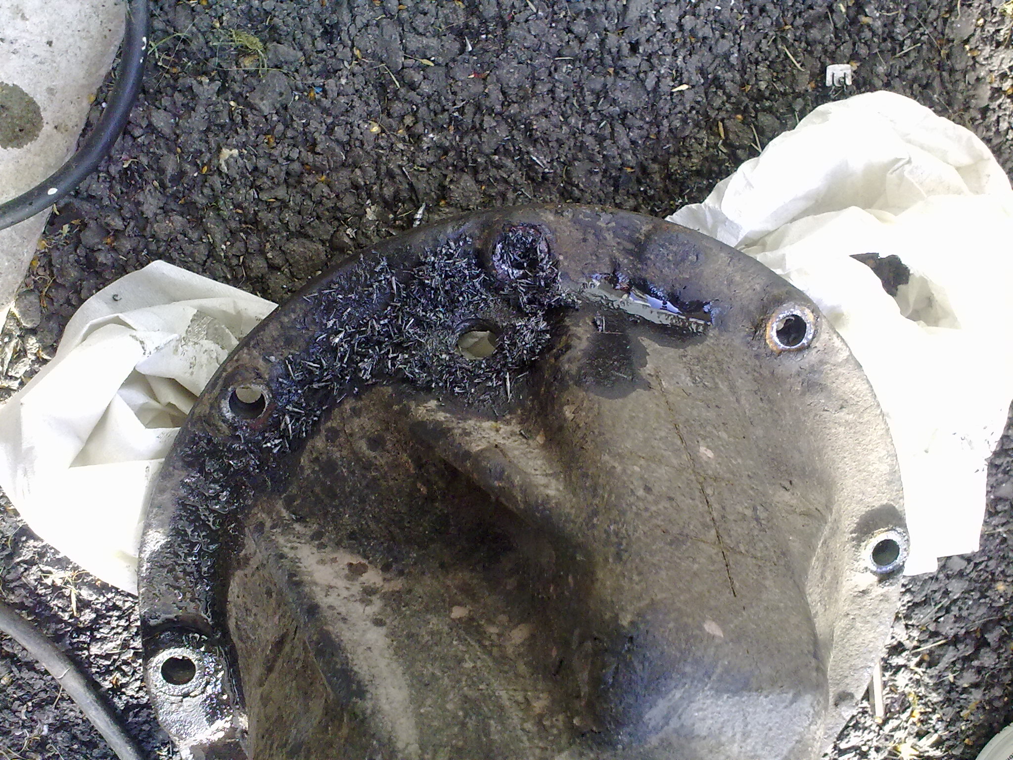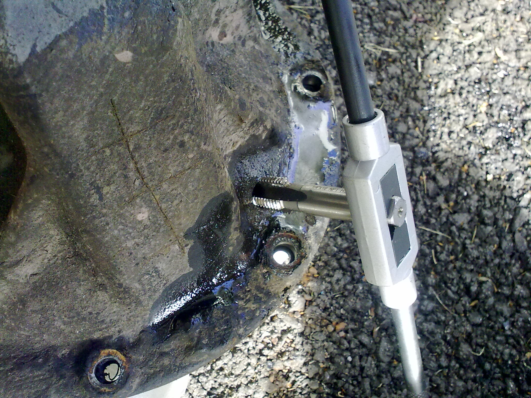 Jeg har valgt den lille skrå flata så jeg har skrapet vekk litt av skiten og så borrer jeg først et lite styrehull og deretter et hull vinkelrett på med et 11,2 mm bor. Bruk skjæreolje så holder borrene mye lenger. Legg litt papir inne i diffhuset så du slipper å få en masse borspon inn i difflager etc.