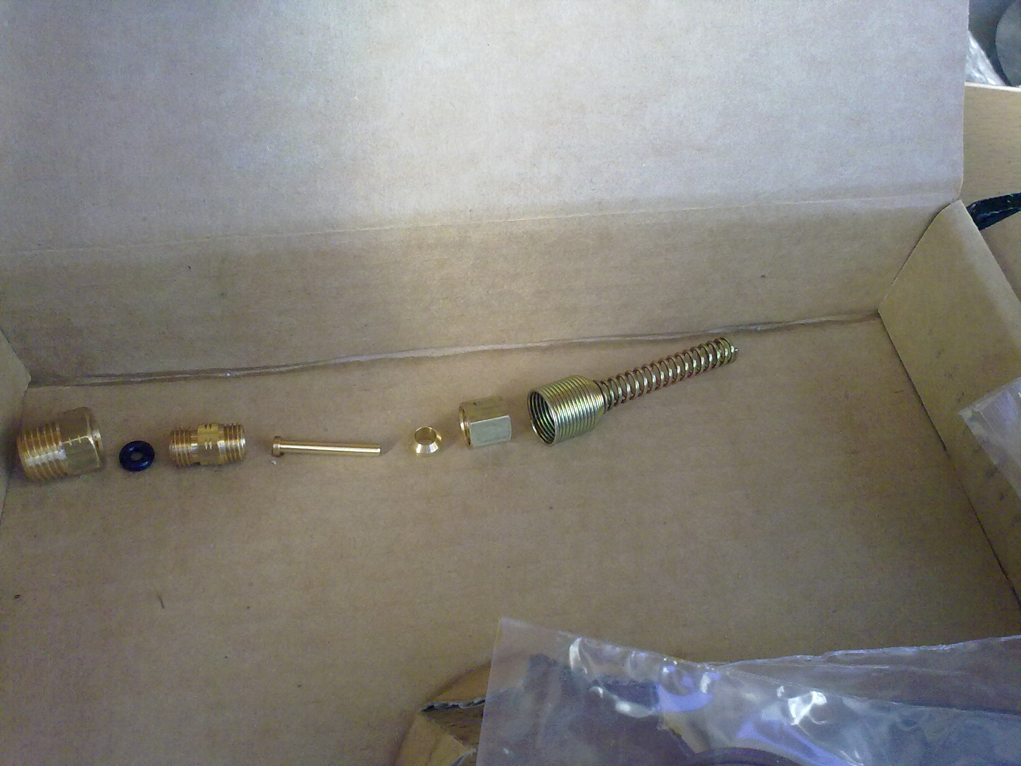 Her ser du de delene som skal brukes. Viktig at de skrues sammen nøyaktig slik de ligger her. Den sorte gummiringen tres inn på kobberrøret som kommer ut av diffen. Jeg synes det røret blir alt for langt så jeg kapper av en passelig bit på 10-15 cm. Mål til hva du synes passer.