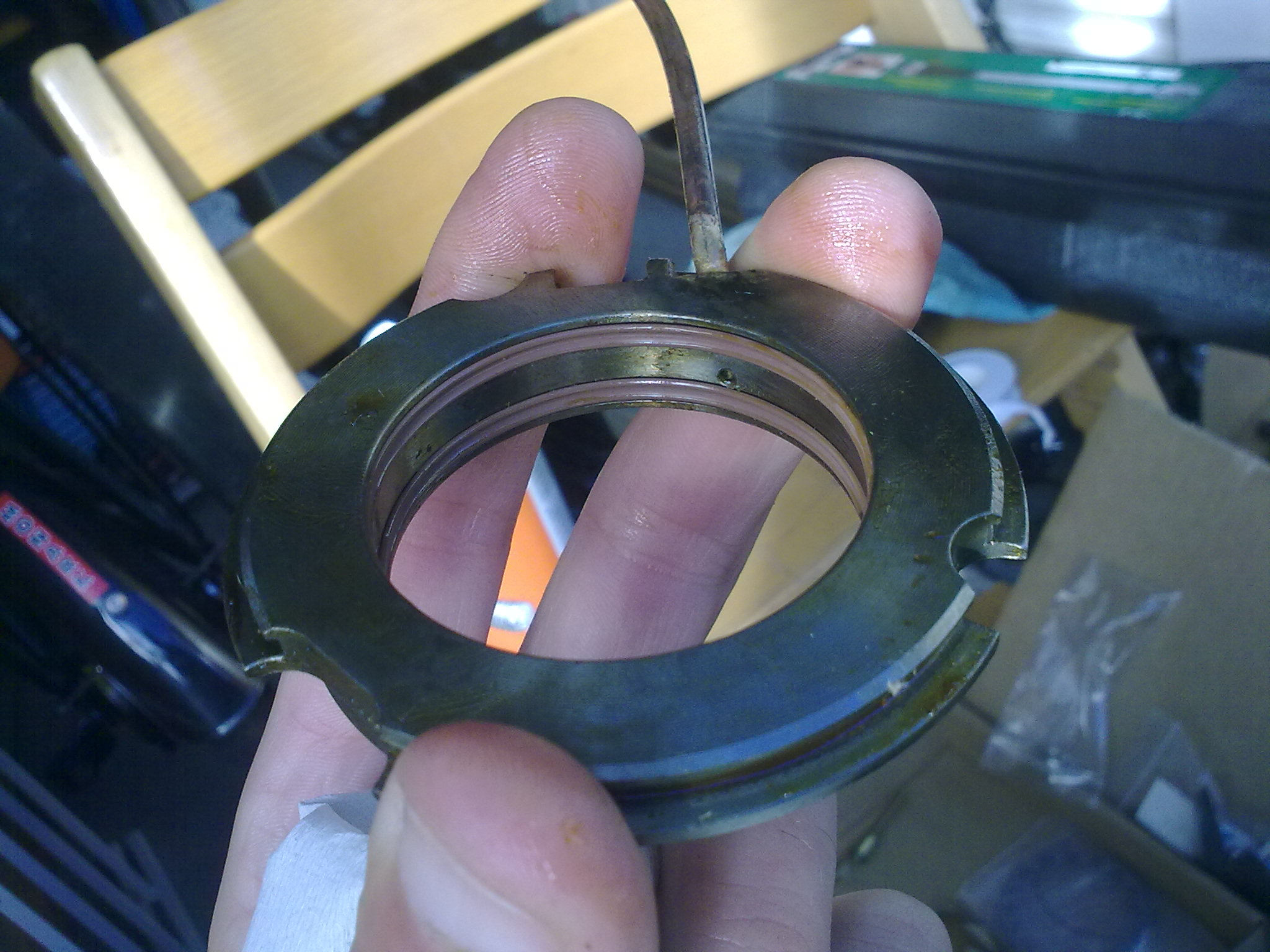 Her er nærbilde av denne ringen med de to tetningene/gummipakningene. Ta litt olje på dem og putt dem inn i sporet som vist her og vær litt forsiktig så du ikke skader dem når det hele skal trees på enden av ARB.