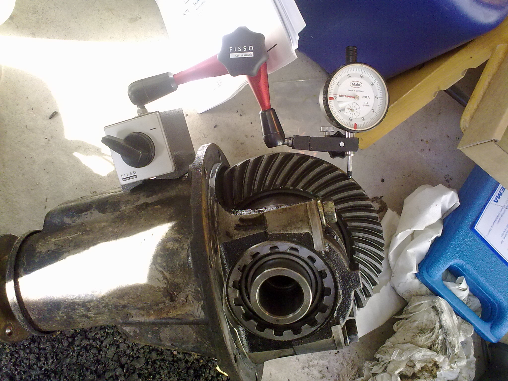 Så er det justering. Jeg bruker litt av samme metode som når en justerer forhjulslager. Jeg skrur kraftig til på begge sider og så kjenner jeg etter om det er litt slark mellom kronhjulet og pinjongen (backslash). Når det kjennes tight og fint ut skrur jeg ut litt igjen og tighter etter på den andre siden slik at slakken øker litt. Så justerer jeg ned slarken bit for bit til den nesten er borte. I dag viste måleuret ypperlig 0,12 på første forsøk. Snurrer kronhjulet 90 grader og måler der også. Bør ikke være særlig forskjell. Jeg fikk 0,13 der og det er mindre forskjel enn jeg egentlig klarer å måle. Ok nok i assevis.