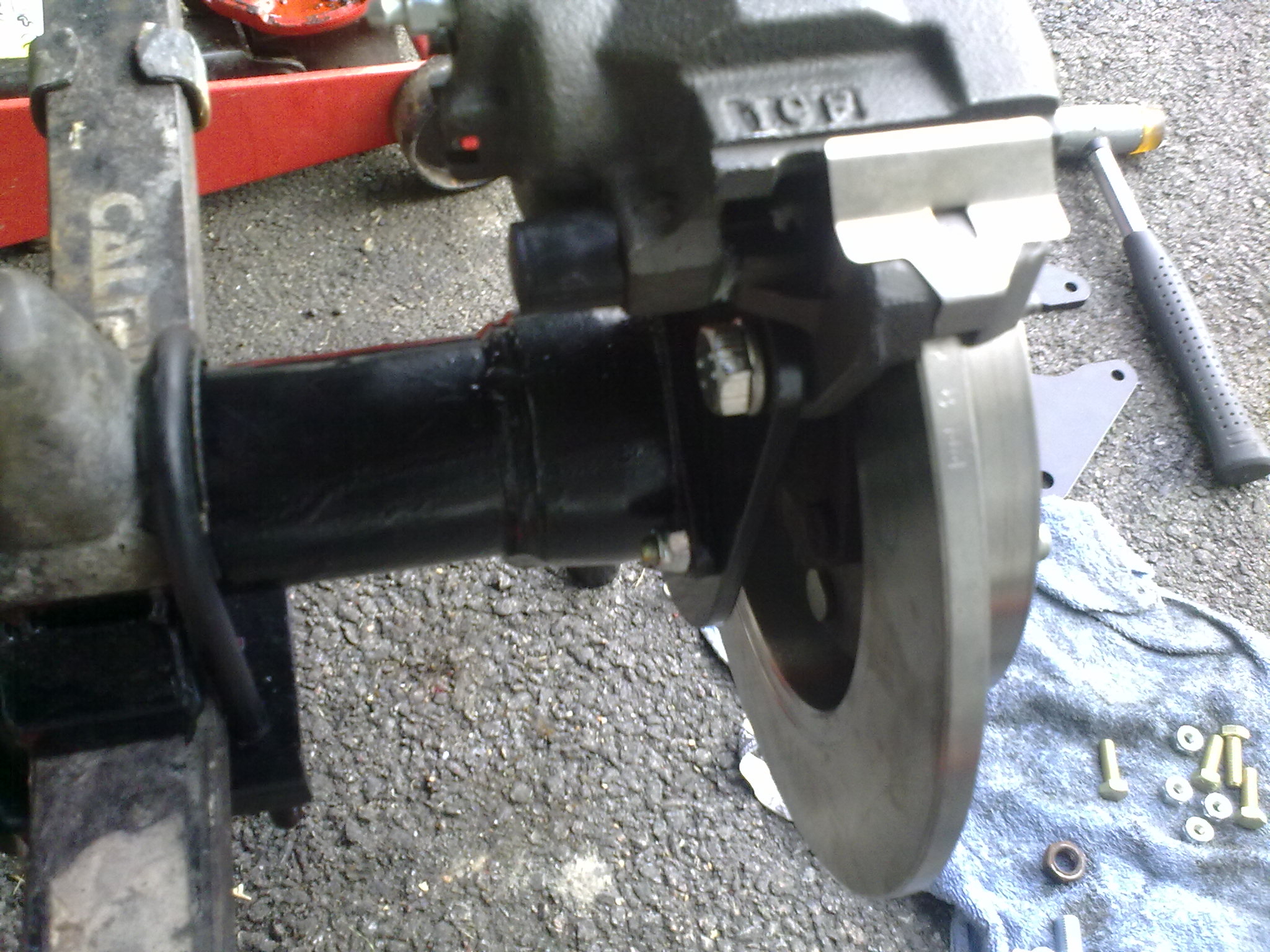 Her er caliperholderen på plass. Den er skrudd i fire bolter og har en utfresing som passer til lageret. Denne er fra TT.