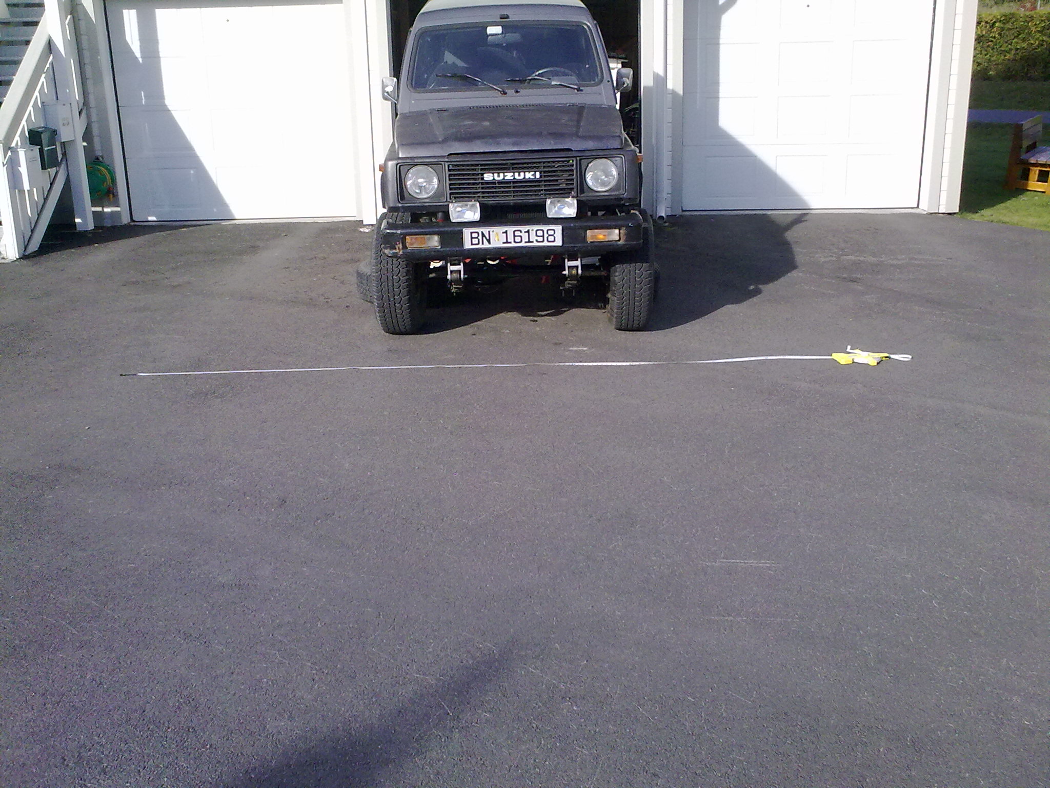 Hadde en diskusjon med Svein om hvor stor plass en trenger til et lite verksted. Jeg har på bilde 1 lagt et målebånd som viser bredden på rommet hvor jeg skal ha hobbyverksted for å skru bil. Parkering blir et annet sted med parkering for to biler, hvor det er såpass mye plass at med en LJ helt innerst er det plass til en SJ ytterst. Dette verkstedet er kun for bil som det jobbes med. Det er bredde nok til at begge dørene kan stå åpne og det er fremdeles greit å gå forbi uten å komme borti dørene eller veggen.