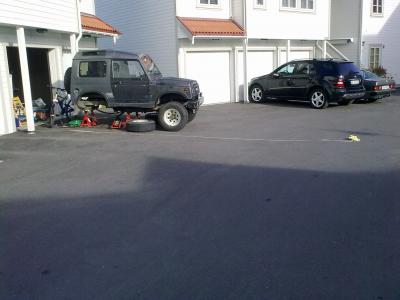 Det som mangler nå er å lage nye bremserør, bygge om hovedbremsepumpa så den gir nok volum til skivene pluss å sette inn en reduksjonsventil på skivene bak slik at bakhjula ikke bare låser med en gang. Det må en unngå ellers blir det sleng på bilen ved harde oppbremsinger. Særlig på vinterføre. Til slutt blir det å sette opp luftkompressor, tank og styringen til ARB. Legger ut bilder etter hvert. Når det er gjort blir det overhaling av ei girkasse og innsetting av G16B 16V motor med snorkel og vinsjer i firkantfester.