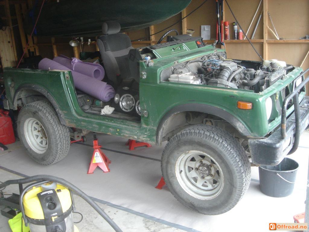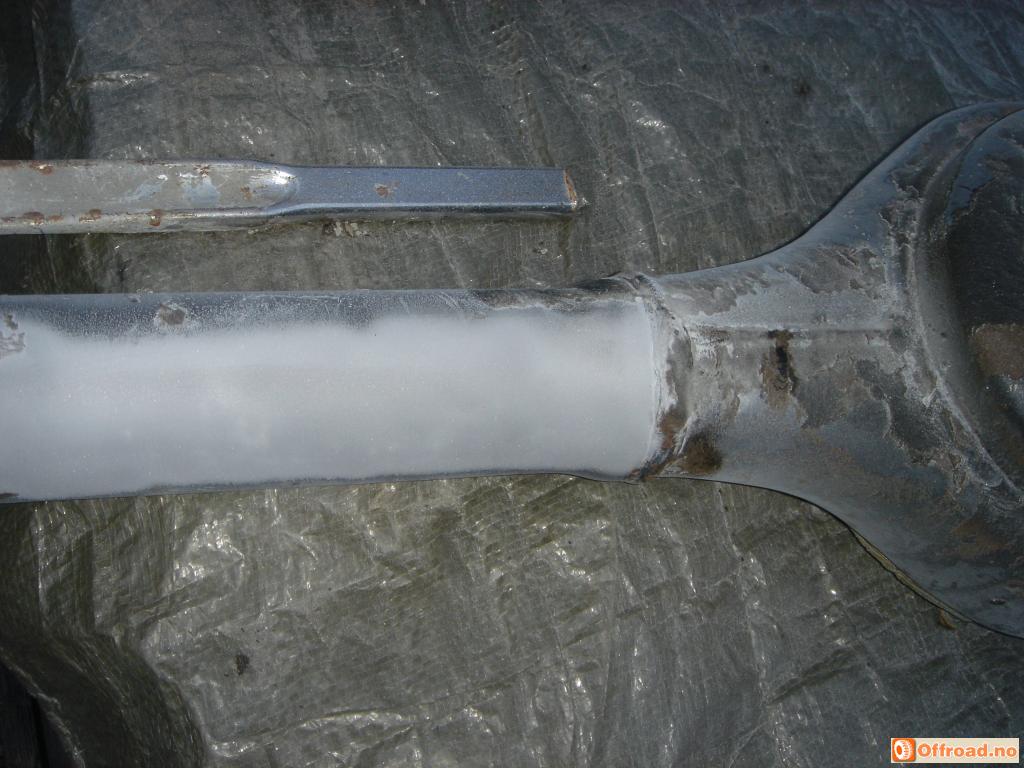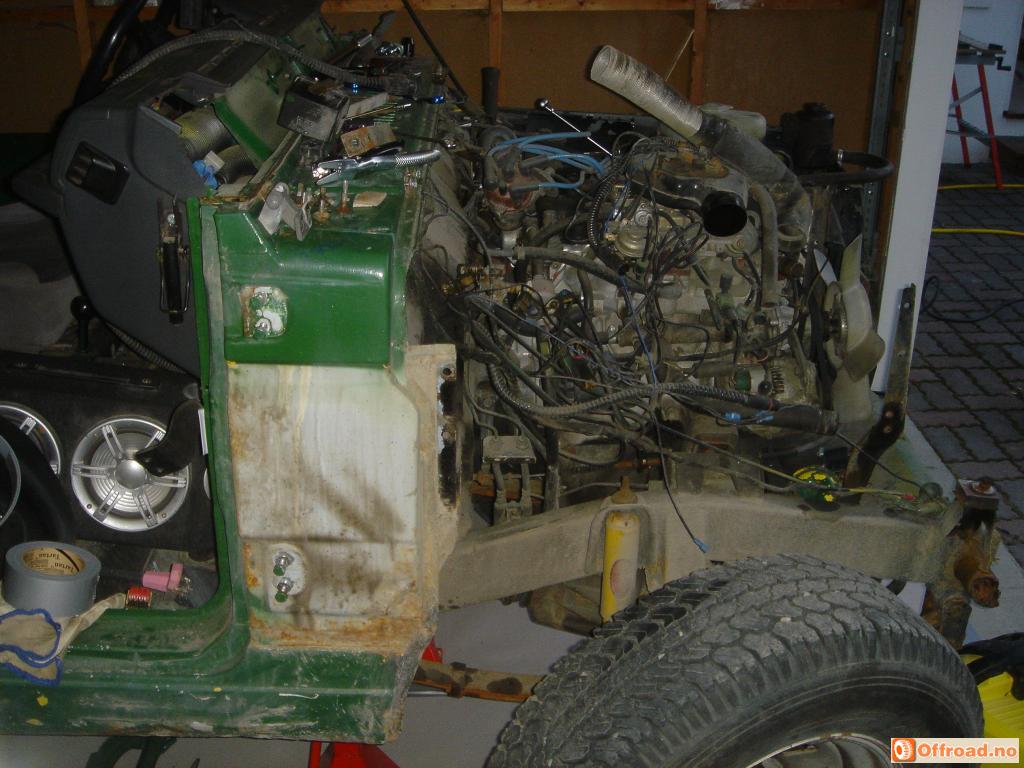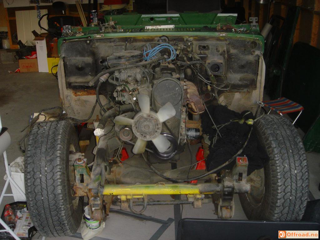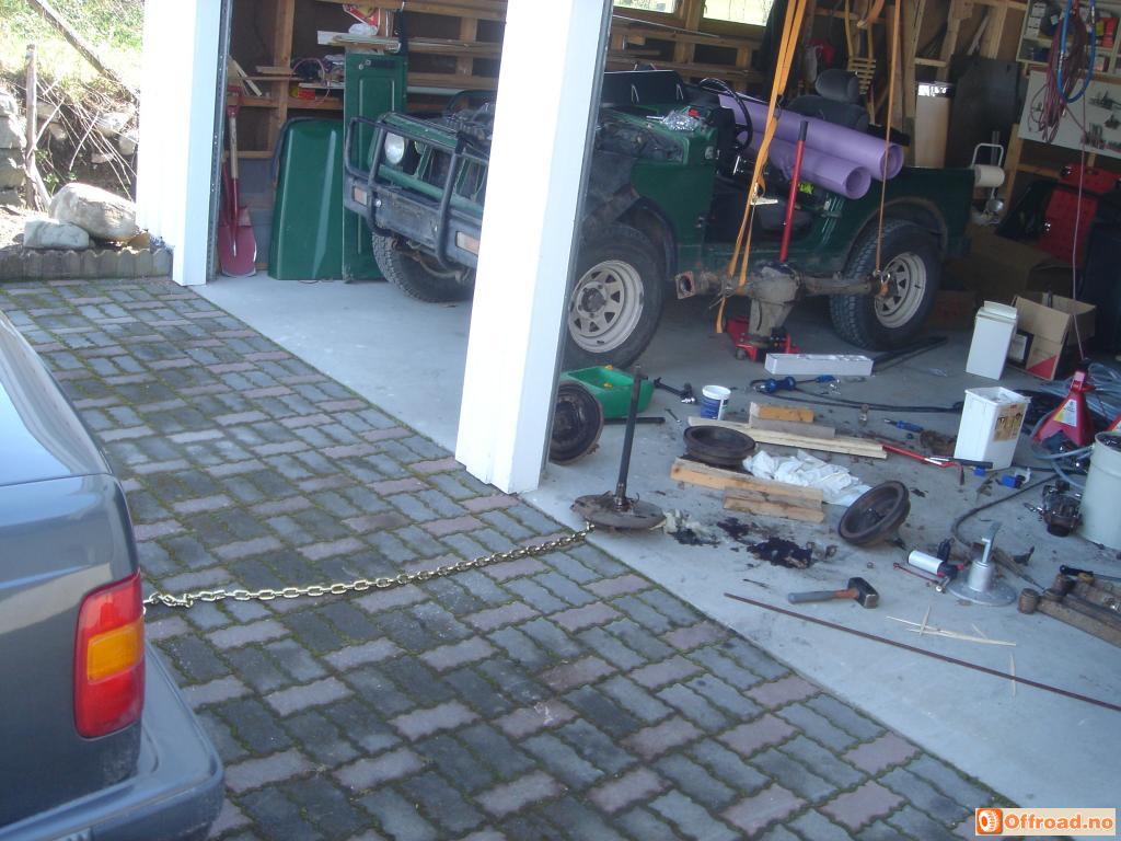 Nedpukking og sandblåse rent ned til metall. Både ramme og karosseriet. Så skal åpningen i hjulbuene kuttes større for å gi plass til større dekk.