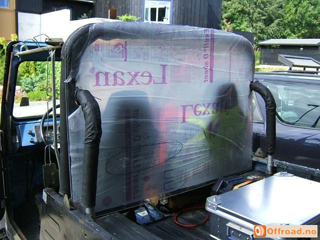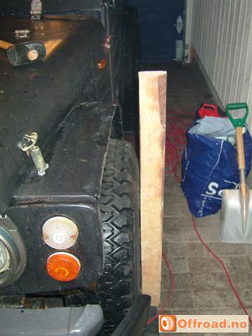 De nye dekkene stakk litt utenfor, 12 cm....så jeg la på noe gummi matter og en skjerm fra en New Holland traktor delt i to foran. Dette ble midlertidige løsninger for å holde bilen på veien.