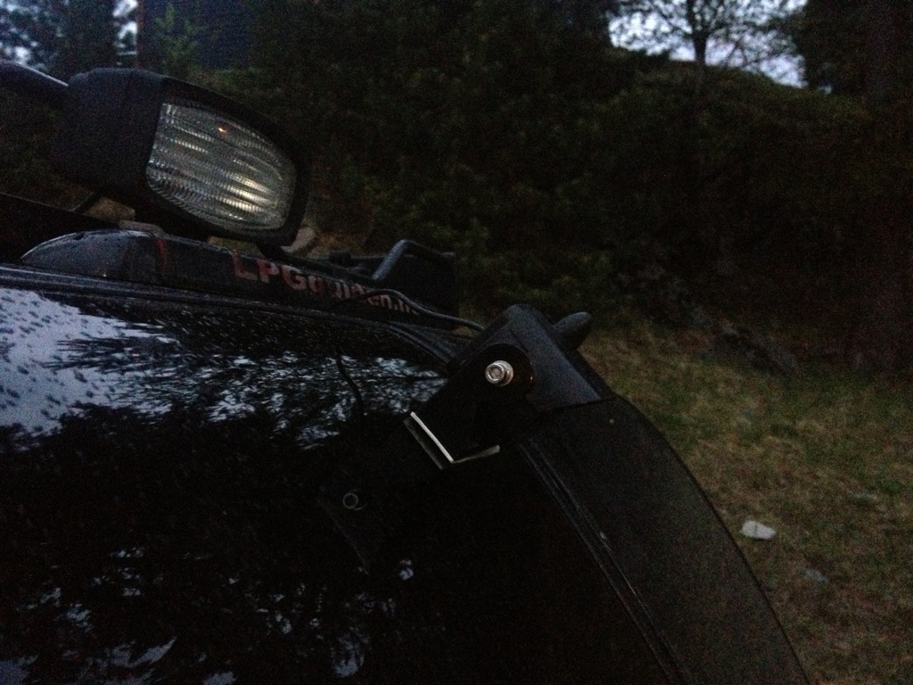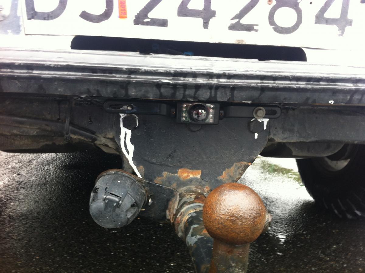 Under bak fangeren, over hengerfestet. Så ser delver av kulen til henger festet. Må se om jeg finner en annen plass, for jeg mister lit dybde syn på det. I dag trodde jeg at jeg var rimelig nær veggen, men var fortsatt 40-50cm fra.