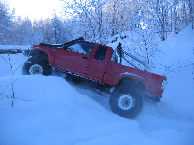 Det e godkjent ombygt til 2,8 sugediesel, godkjent viltfanger, bygd om til personbil, 33x12,5x15, hjæmlaga skjermbreddera, caps, rust-styling overalt, matt svart me en go del røde felt fra originallakken...rætt å slætt ett skogstroll!
