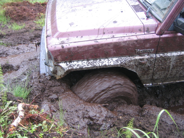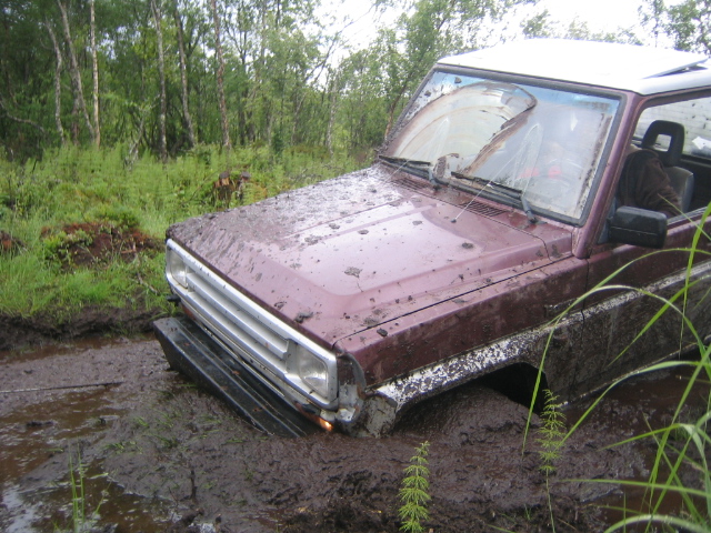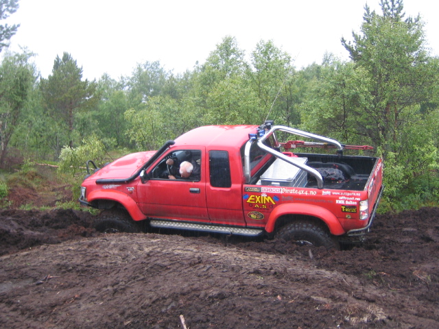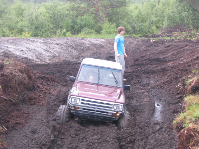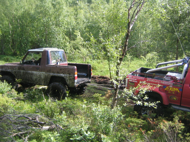 Så han måtte berges ut.. en bil som slepa han bakover.. med veldig kort stropp.. og en bil som prøvd å styr framenden sånn høvelig..