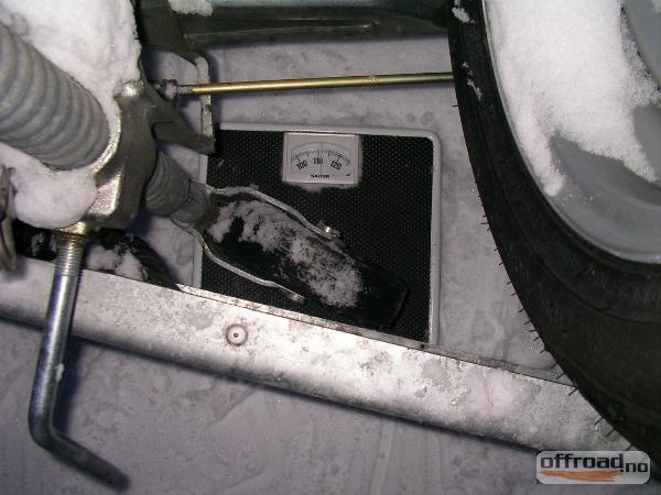 Ettersom kjærringa har brukt trumf-poengan t ny digital bad-vekt, så fikk eg disp t å bruk den andre t å finn "balansepunktet". Godt og vel 100 kg på nesehjulet må jo bli rimelig greit! Når eg va ferdig å juster, så veid eg plutselig sjøl 20 kilo meir på den vekta enn ka eg gjor i utgangspunktet! Så Trur ikkje den lenger e t å stol på...